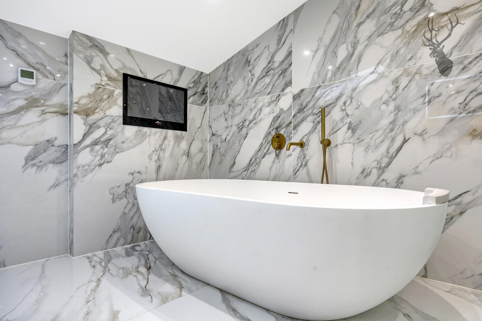 Ascending to the first floor, residents are greeted by four generously proportioned double bedrooms, each adorned with fitted wardrobes. Two of these bedrooms feature ensuite shower rooms, providing an added layer of comfort and luxury. The family bathroom, characterized by full marble tiles, a freestanding bath, and even a television, adds a touch of opulence to daily living.