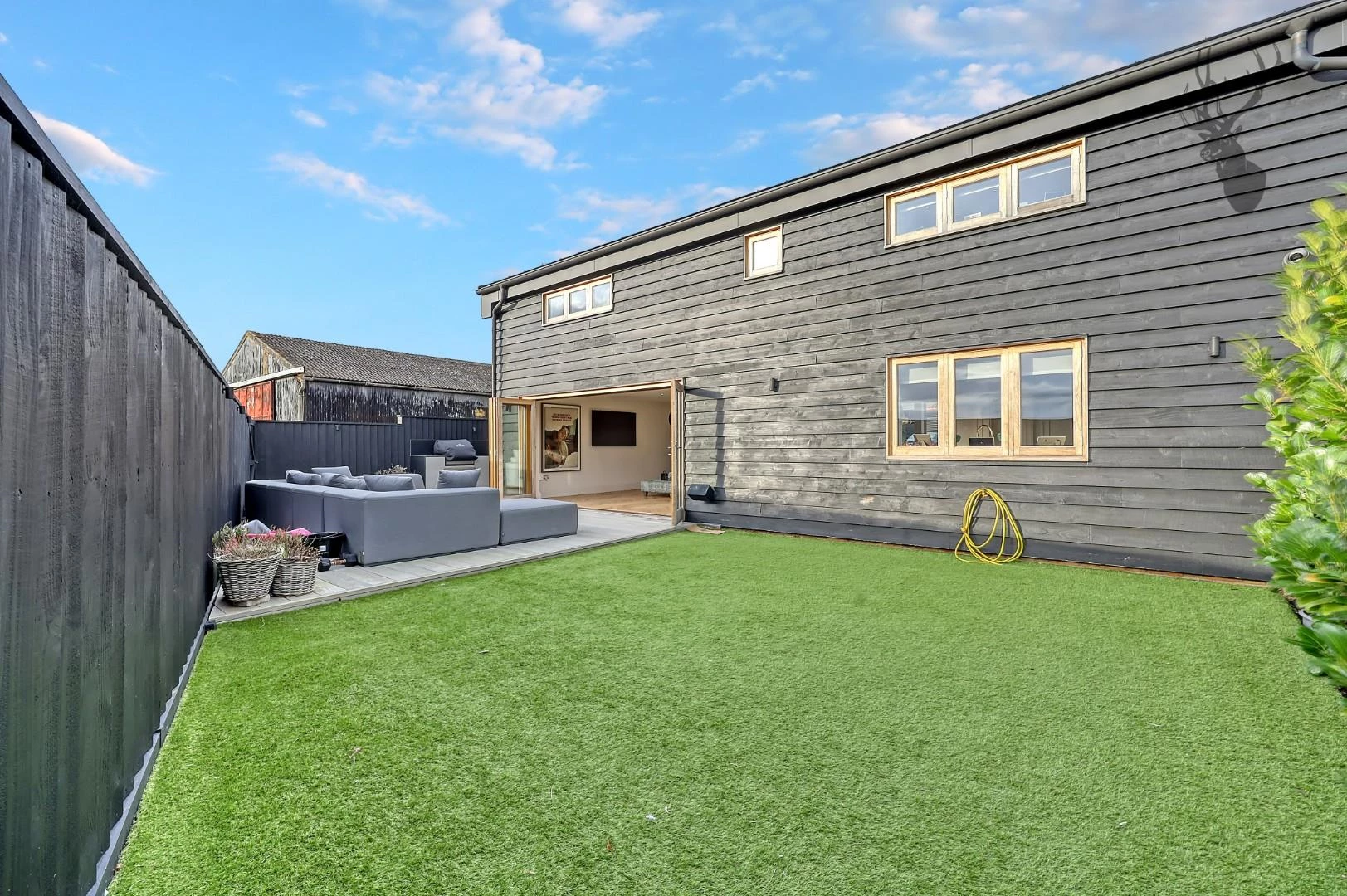 Externally, the property boasts a well-appointed driveway, a garage for secure parking, and a low-maintenance rear garden. The outdoor space is enhanced by an outdoor kitchen, offering an ideal setting for al fresco dining and entertaining.