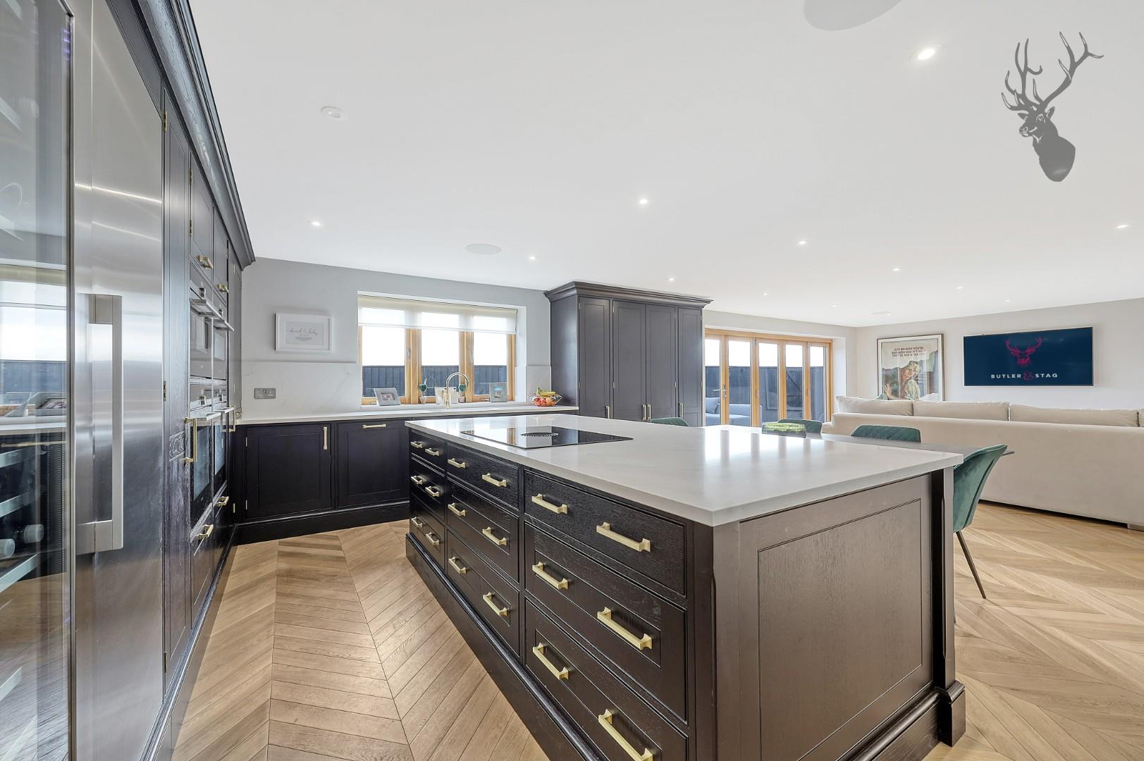Upon crossing the threshold, a spacious hall adorned with floor-to-ceiling windows beckons residents and guests alike. The ground floor unfolds to reveal a dedicated cinema room featuring an integrated sound system, an additional reception room currently serving as a playroom, and a convenient WC. The focal point of this residence lies at the rear, where a bespoke kitchen awaits. Boasting top-tier appliances, including two ovens, a microwave, steamer, full-size fridge, freezer, and wine cooler, this culinary haven is complemented by a central island with granite worktops, sink, and hot tap. The kitchen seamlessly integrates with a pantry cupboard, dining area, and family space adorned with a log burner. Further enhancing practicality, a utility room equipped with water softener, CCTV, and a sound system completes this area.