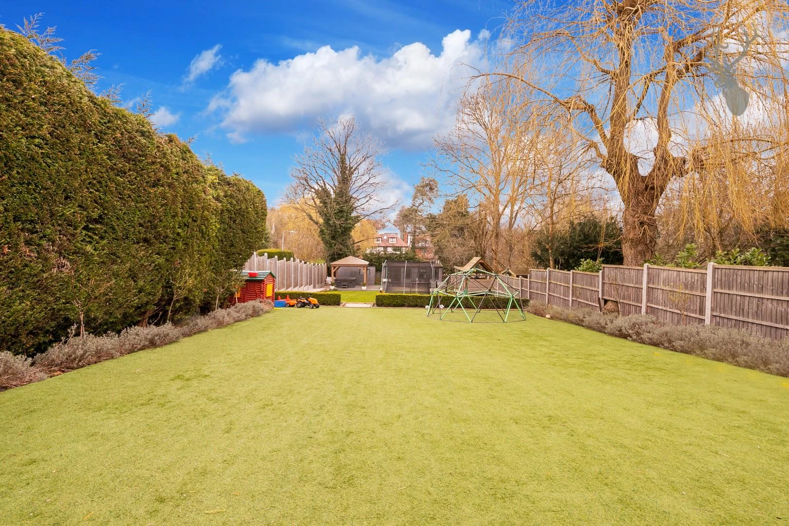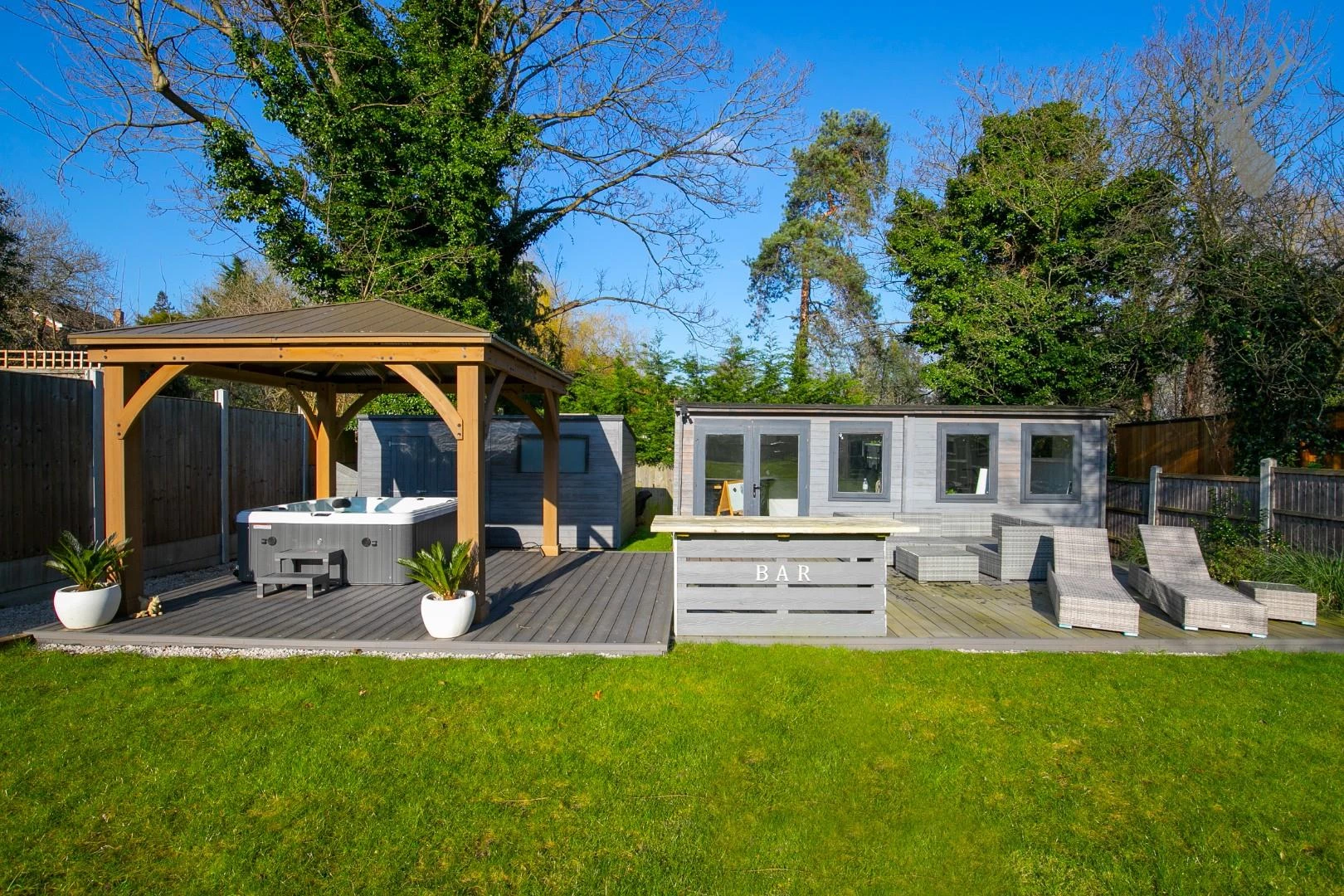 Externally, the 164 ft rear garden comprises of three tiers, the first which is initially met upon leaving the kitchen with a wonderful block paved patio area screened via a glass balustrade offering the highest views over the garden and a perfect space for alfresco dinning. The second tier is fully laid with artificial lawn making it a welcoming space all year round for children to play on. Finally, the third tier of garden is laid with partial lawn which then meets the decked entertaining area leading up into the spacious summer house which operates fully via electricity and currently houses a working office desk, gym equipment and snug area for the current owners. A storage shed also sits adjacent to the boundary fence which completes the garden. To the front of the property, the secluded driveway provides private parking for five plus vehicles.