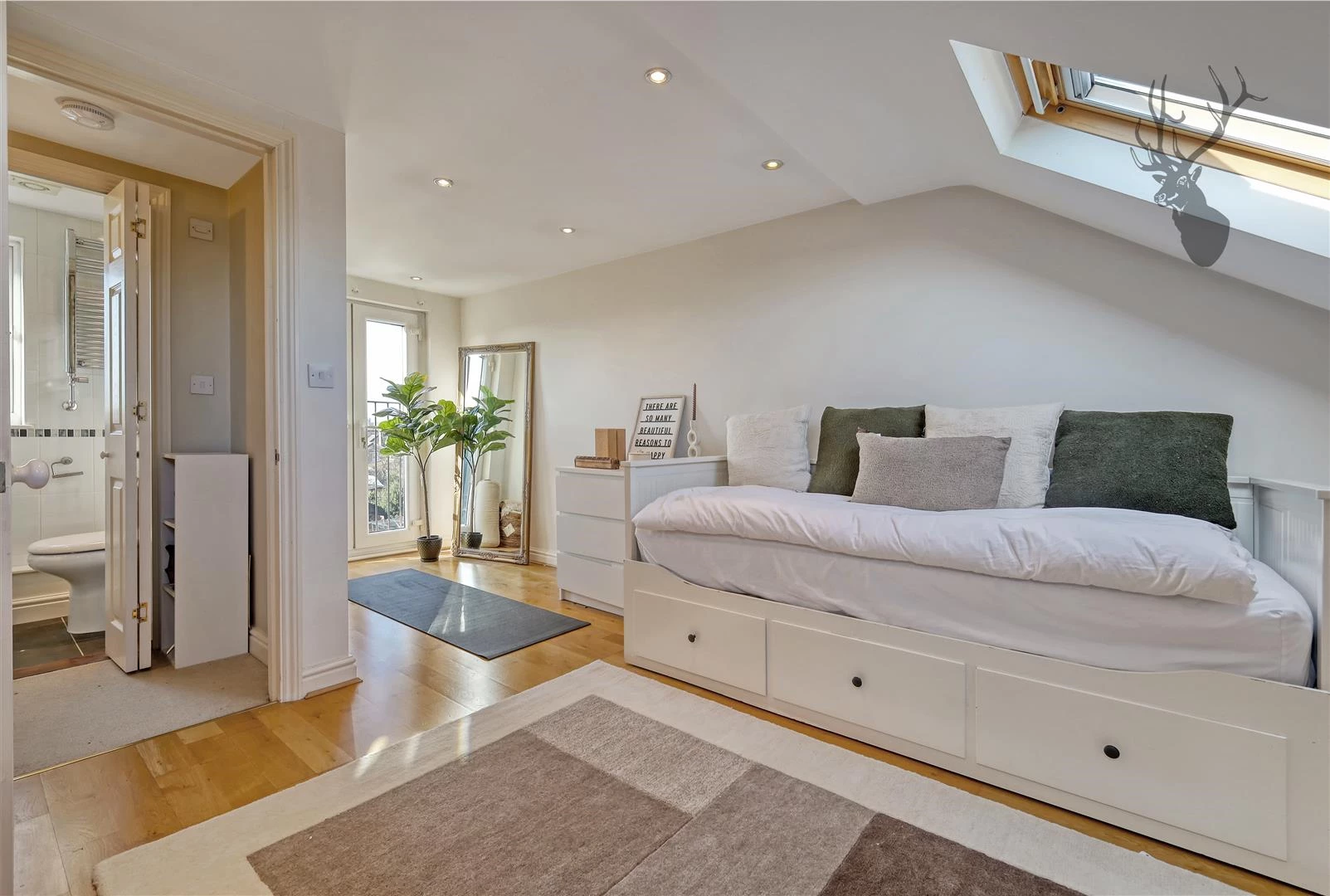 Upstairs, you ll find three generously sized double bedrooms including a comprising master bedroom each with its own charming feature fireplace, and a family bathroom. The property also benefits from a loft conversion, offering an additional bedroom with a stylish shower room, ideal for guests or as a private retreat.