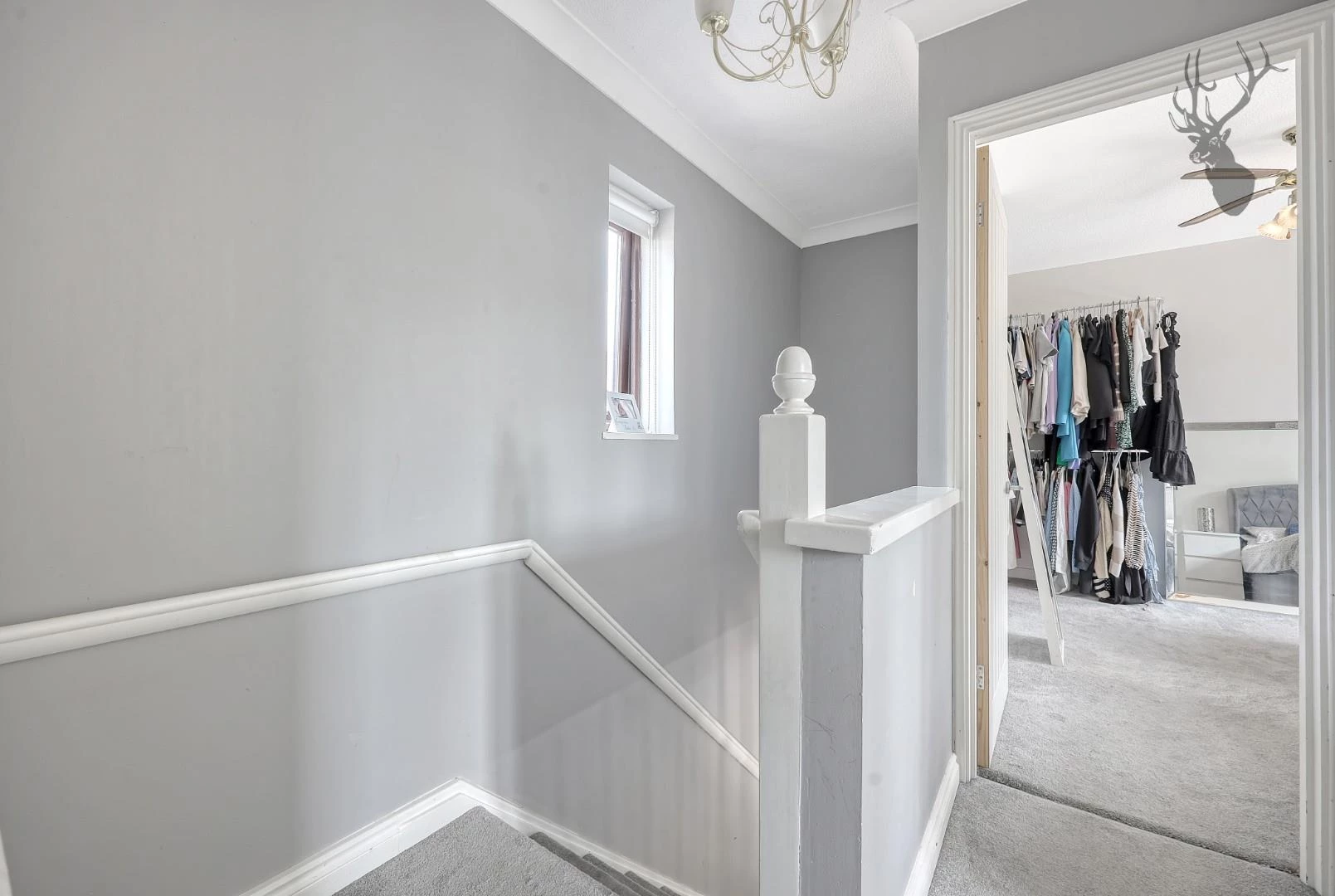The first floor features a spacious master bedroom and a second bedroom, both located at the rear and equipped with a range of fitted wardrobes and cupboards. The three-piece bathroom suite includes a shower with a tiled bath surround. The landing offers convenient loft access via a drop-down ladder.