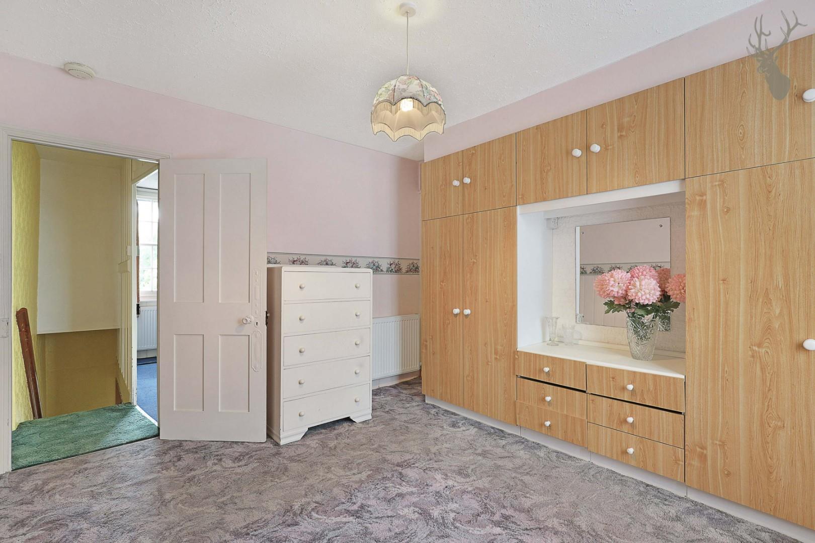 On the first floor, there are two generously sized double bedrooms. The primary bedroom, facing the front of the house, includes fitted wardrobes and a built-in storage cupboard. The second bedroom overlooks the rear garden and also benefits from fitted wardrobes and storage.