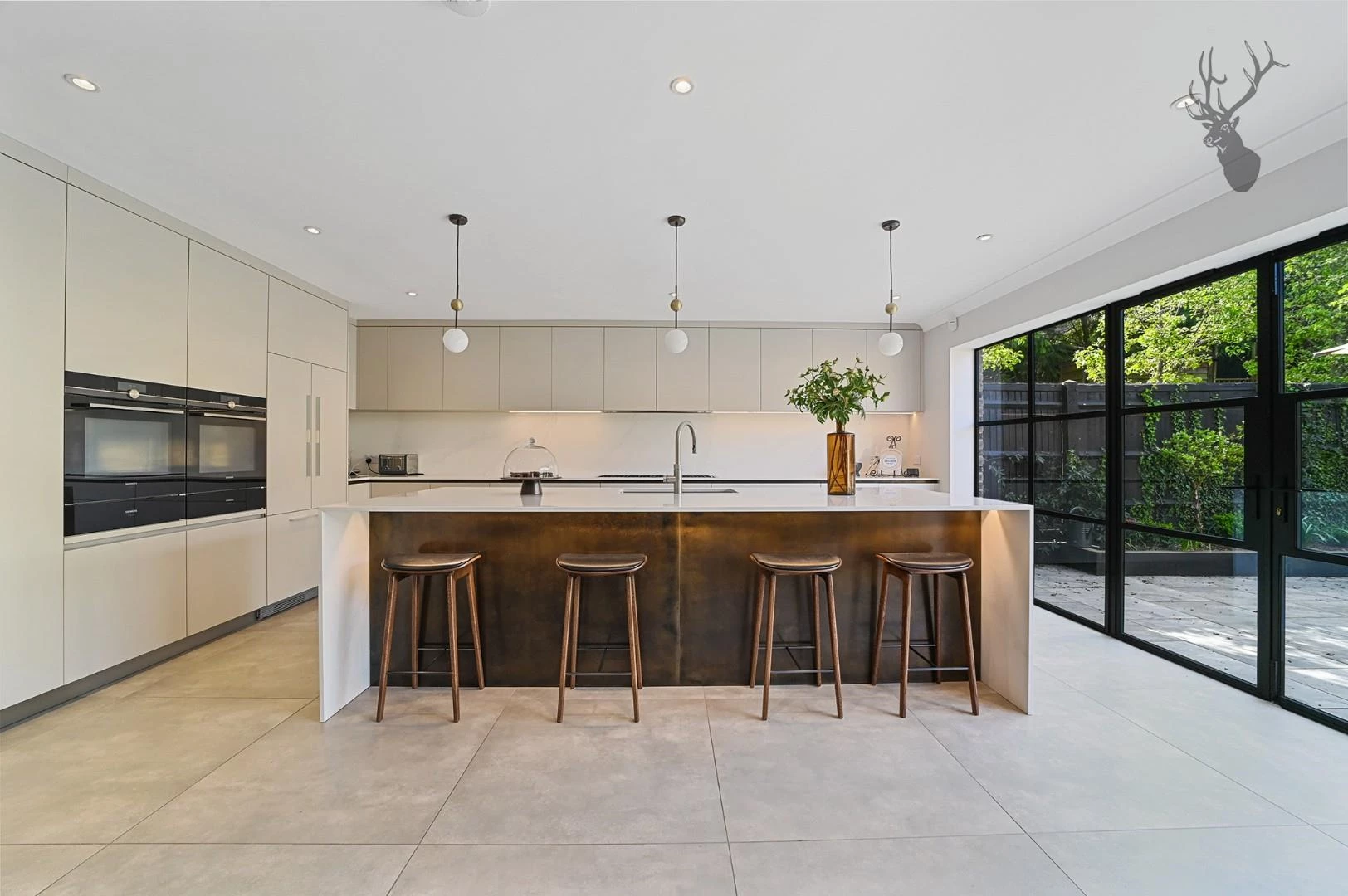 The entrance hall sets the tone for the quality of the home, with double height ceiling, bespoke European oak herringbone flooring, and a feature glass staircase leading to the first and second floors.