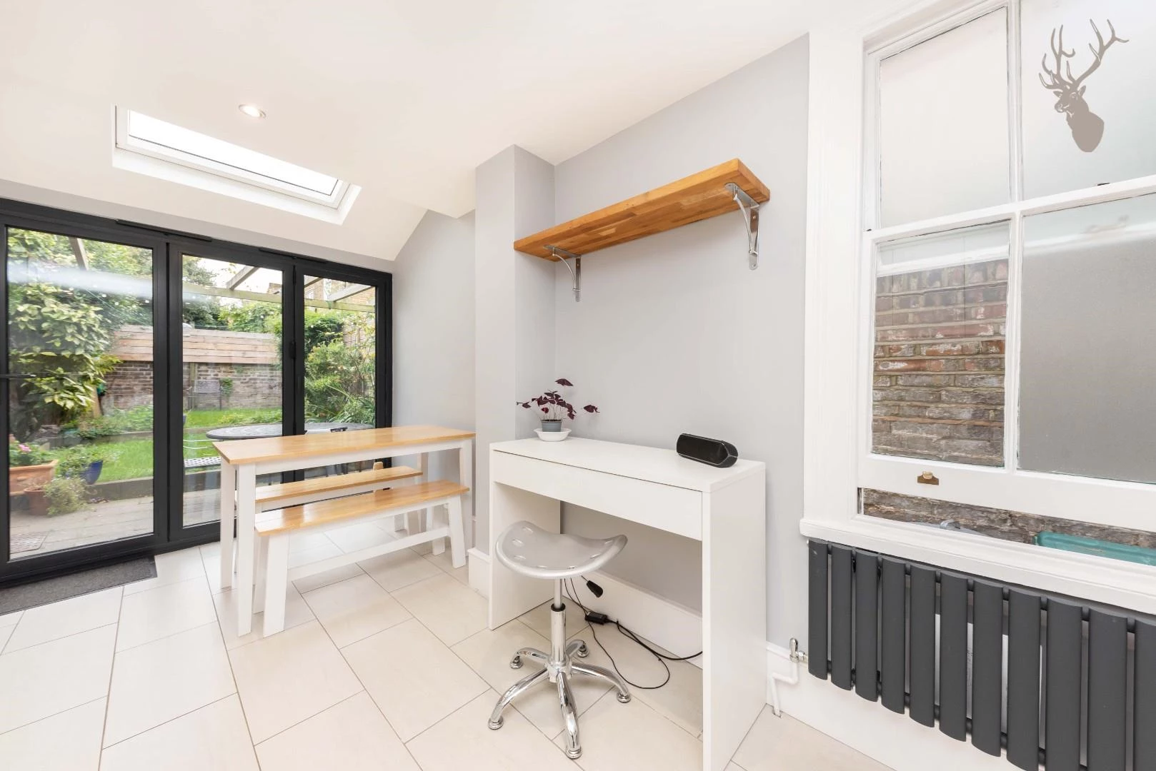 This duplex town house benefits from a blend of period features and contemporary touches. The double reception area on the ground floor has bay sash windows and shutters, wooden floors, a fireplace that flows into a dining area. The kitchen is dual aspect, finished to a high standard and boasts lots of storage, tiled floor, fully integrated appliances, a second dining area, a skylight and double glazed bi-folding doors that open onto the garden. The garden is spacious and Southwest facing meaning it will be bathed in light regardless of the time of day. The garden is also accessible via the Reception/Dining room via a side door. There is a separate utility room with a W.C. and extra storage.