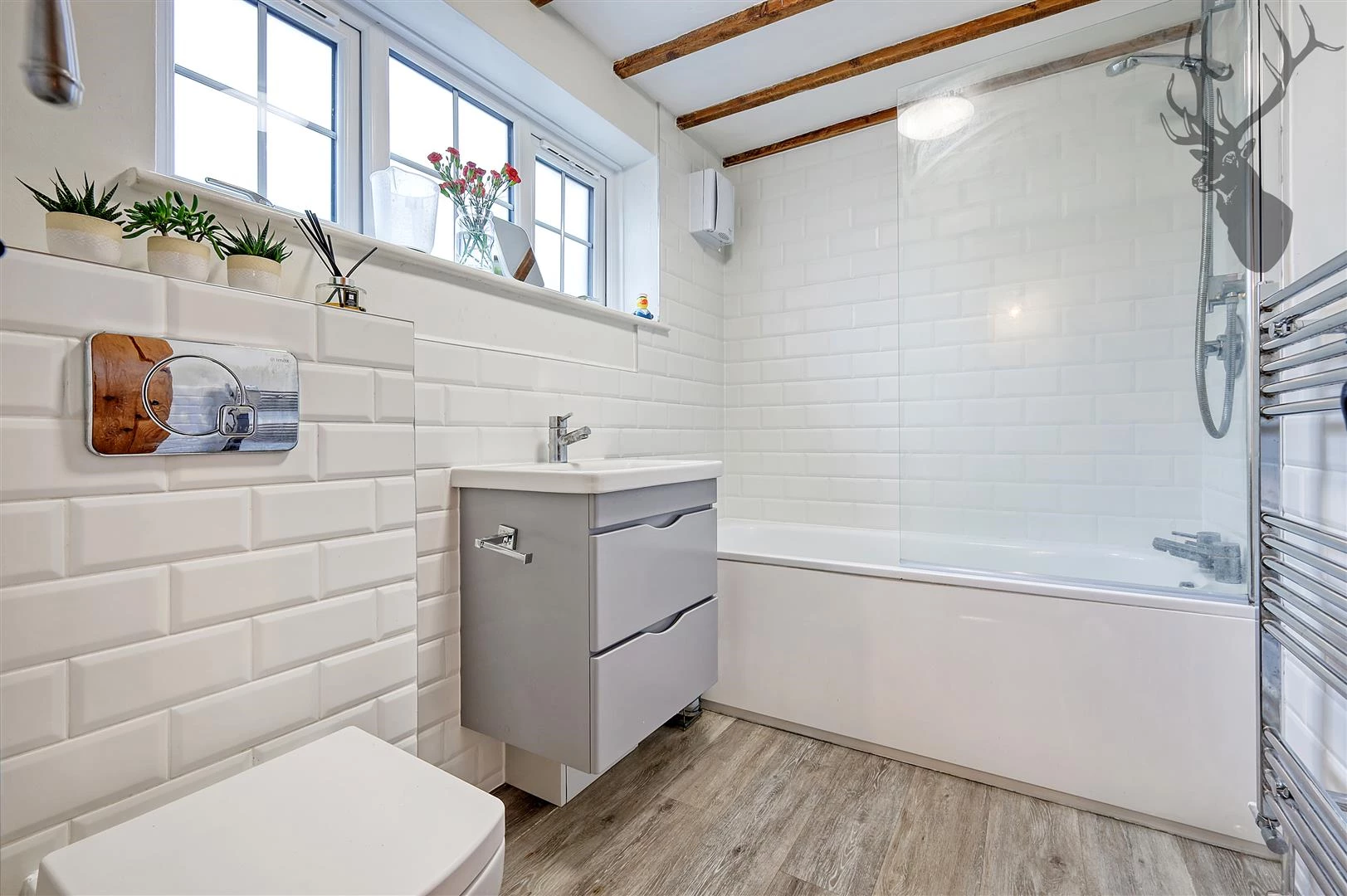 The ground floor boasts a spacious lounge with a cosy wood burner, perfect for relaxing evenings. The stylish shaker kitchen, equipped with fully integrated appliances, opens onto a delightful south-facing garden, ideal for entertaining or enjoying the sunshine in peace.